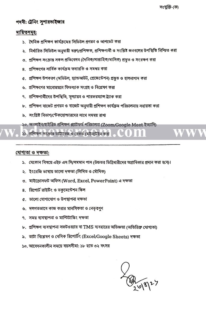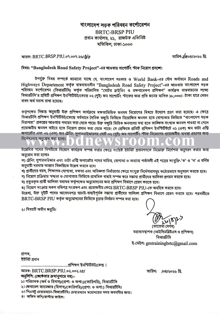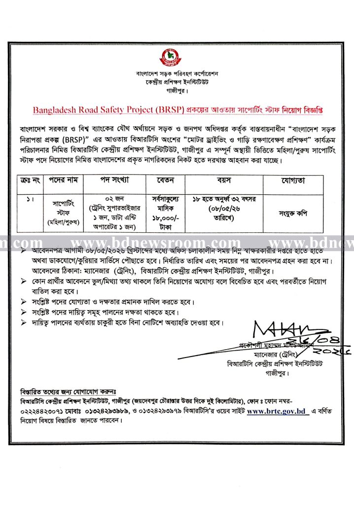 বাংলাদেশ সরকার ও বিশ্ব ব্যাংকের যৌথ অর্থায়নে সড়ক ও জনপথ অধিদপ্তর কর্তৃক বাস্তবায়নাধীন “বাংলাদেশ সড়ক নিরাপত্তা প্রকল্প (BRSP) ” এর আওতায় বিআরটিসি অংশের “মোটর ড্রাইভিং ও গাড়ি রক্ষণাবেক্ষণ প্রশিক্ষণ” কার্যক্রম পরিচালনার নিমিত্ত বিআরটিসি কেন্দ্রীয় প্রশিক্ষণ ইনস্টিটিউট, গাজীপুর এ সম্পূর্ণ অস্থায়ী ভিত্তিতে মহিলা/পুরুষ সাপোর্টিং স্টাফ পদে নিয়োগের নিমিত্ত বাংলাদেশের প্রকৃত নাগরিকদের নিকট হতে দরখাস্ত আহবান করছে বিআরটিসি কেন্দ্রীয় প্রশিক্ষণ ইনস্টিটিউট, গাজীপুর।